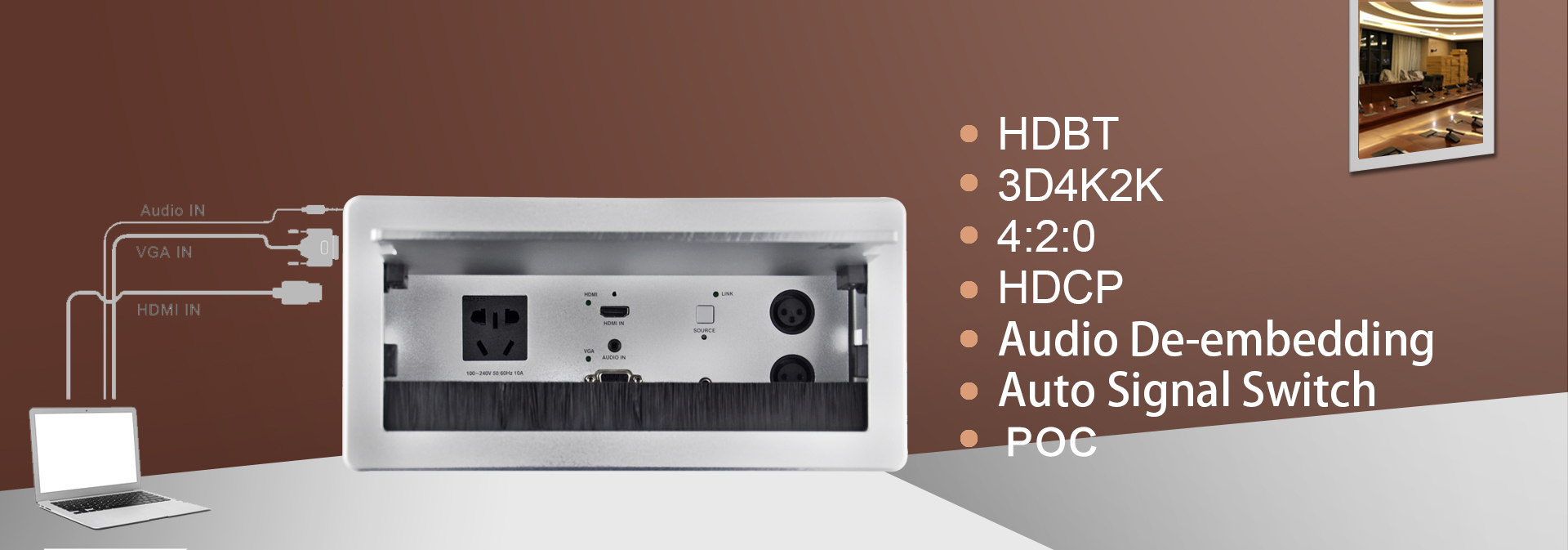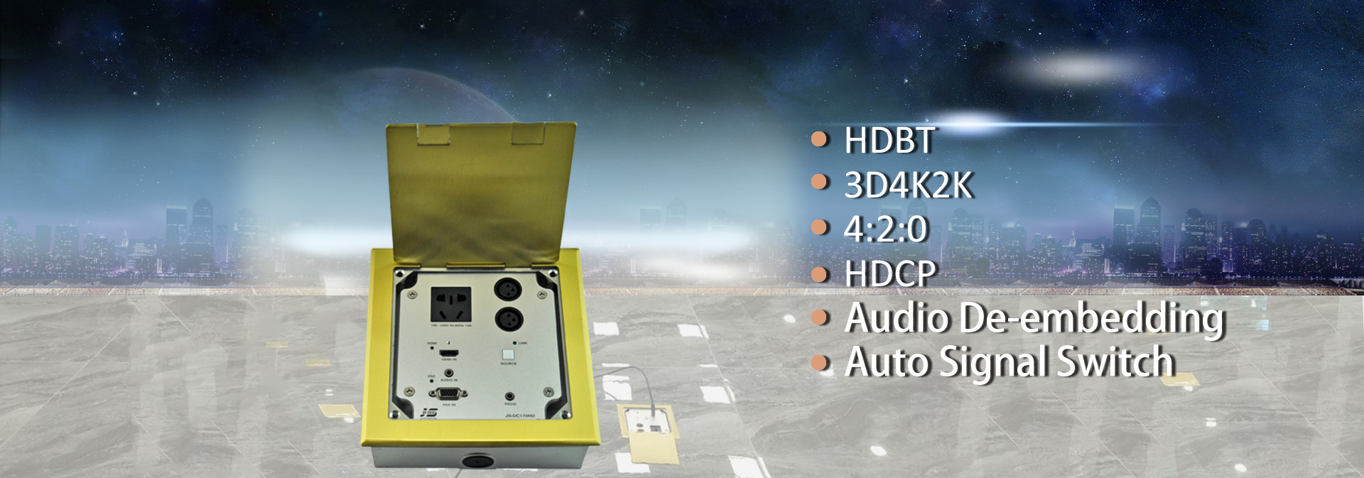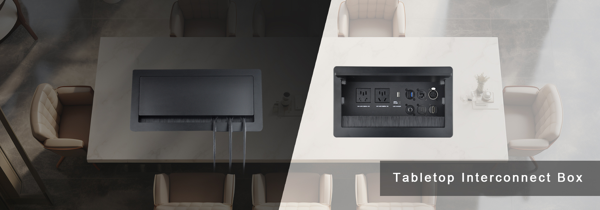 JS series interconnect box is to remove the obstacles by combine all sockets in one plate and special designed conceal structure. It is ? ush- mounted on tabletop with cables connected under table in orderly. Users just need to open the top panel that all ports or cables will appear for use.