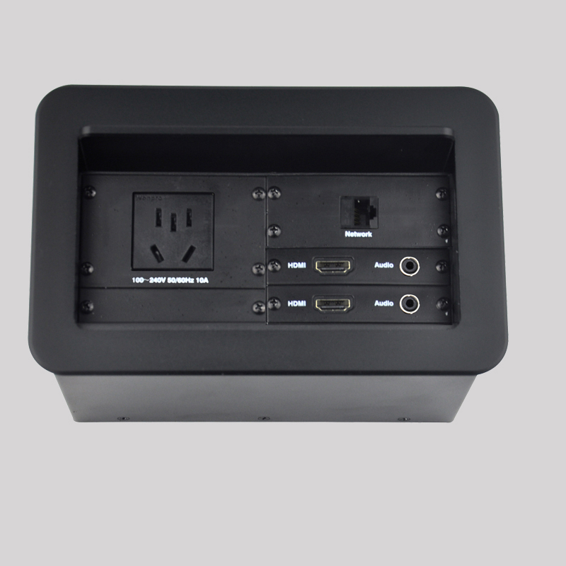 ? JS-5+系列可藏式接線盒提供了一個整潔、緊湊、簡單的鏈接解決方案。接線盒采用氣動與機械閉鎖式結構、上下接口貫穿式設計,巧妙的實現升起和閉合。使用時只需輕按接線盒頂部,釋放機械閉鎖,接線盒被氣動裝置順暢撐開,隱藏的電源、網絡、電話、視頻、音頻等各種接口即呈45°展現出來。使用完畢后,輕按接線盒頂部,機械閉鎖關閉,各種接口隱藏起來,隱藏后的接線盒與平臺保持水平。